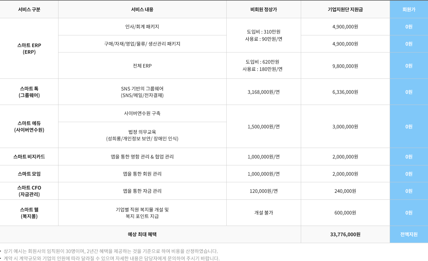 | 복지몰 | 기업별 복지몰 개설 | 1,000,000원/연 | 2,000,000원 | 0원 | |