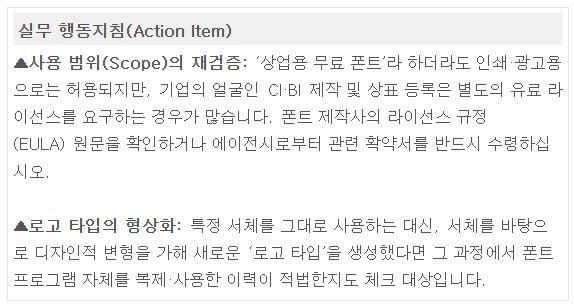 외주 에이전시를 통해 BI를 개발할 때 가장 흔히 발생하는 사고 중 하나가 폰트(서체저작권 분쟁입니다제작사가 무료 폰트를 썼으니 괜찮다라고 말해도그 무료의 범위가 어디까지인지 반드시 직접 확인해야 합니다.