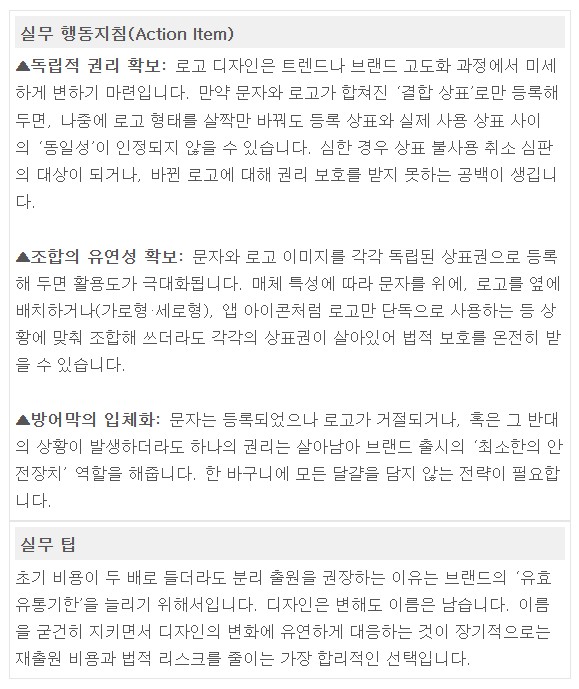 로고 디자인 시안이 확정되면 이를 문자 따로로고 이미지 따로’ 분리해서 출원할지아니면 하나로 합친 결합형으로 출원할지 결정해야 합니다이는 단순히 출원 비용의 문제가 아니라브랜드의 생애주기를 관리하는 고도의 경영 전략입니다.
