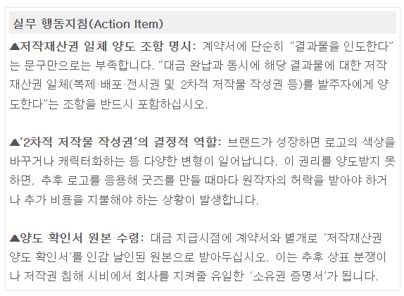 상표권은 출원인이 가질 수 있어도그 로고에 관한 저작권은 별개의 문제입니다저작권법상 특약이 없는 한 창작자(에이전시)에게 원천적인 권리가 귀속되기 때문입니다. “돈을 줬으니 당연히 우리 것 아닌가라는 안일한 생각이 추후 발목을 잡는 경우가 많습니다.