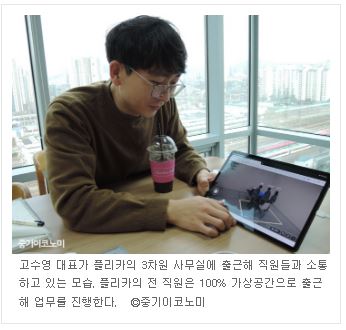 플리카의 전 직원은 100% ‘플리카 랜드’라는 3차원 공간에서 근무하고 있다. 몸은 집에 있지만, 가상공간으로 출근하고, 이곳에서 모든 업무와 소통을 하는 것이다. 다소 생소한 업무방식을 설명하기 위해 고 대표는 인터뷰 중에 가상의 오피스에 접속해 회사 전경과 직원들을 소개했다.