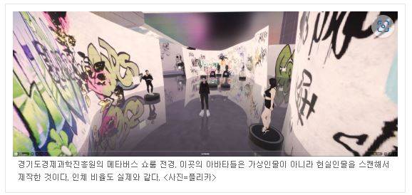 가상공간이라고 해서 현실과 동떨어지지도 않았다. 일례로 경기도경제과학진흥원의 지원을 받은 40개의 패션브랜드의 제품을 걸치고 있는 아바타들은 가상인물이 아니라 현실인물을 스캔해서 제작한 것이다. 인체 비율도 실제와 같다.