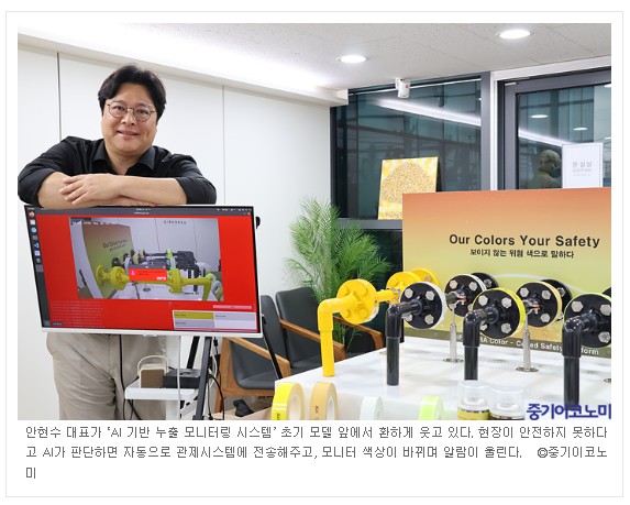 안현수 대표는 AI 시대를 맞이해 색으로 보는 안전에도 AI 시스템을 적용할 예정이라고 밝혔다. 실제로 인터뷰 장소에 큰 모니터가 사무실 안을 비추고 있었는데, ‘AI 기반 누출 모니터링 시스템’ 초기 모델이었다. 안현수 대표가 모형도에 붙어 있는 테이프에 살짝 변색을 시도했더니 모니터의 색상 자체가 변하면서 사무실 전체에 큰 알람이 울려 퍼졌다.
