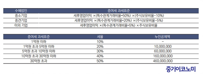 한계보유비율은 일반법인의 경우 3%, 중견기업과 중소기업의 경우 10%를 말한다. 중견·중소기업의 경우에는 한계보유비율을 초과한 자에게 증여세를 부과한다고 해, 보유지분 전체에 대해 과세를 하는 것이 아니라 초과하는 비율만큼만 부과한다. 자세한 증여세 계산식은 아래와 같다