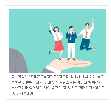 중소기업은 자금 부족으로 복지정책을 운용하기 어렵기 때문에 근로자의 장기근속률이 낮고, 이직 비용이 높아지는 악순환으로 이어질 수 있다. ‘공동근로복지기금’ 제도를 활용해 내실 있는 복지정책을 마련해간다면, 대기업과 중소기업 간 양극화 현상을 어느 정도 해소하면서도 근로자의 실질소득을 높이고 협력적인 노사관계를 형성할 수 있는 발판이 될 것으로 기대할 수 있다. (중기이코노미 객원=노무법인 원 김현희 노무사)