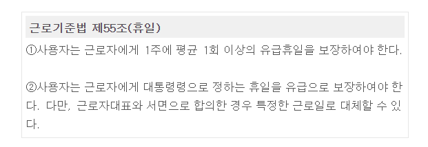 우리 근로기준법은 한 주 동안의 소정근무일에 개근하면, 하루의 유급휴가를 부여하도록 한다.