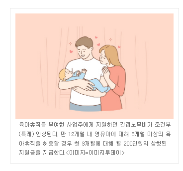 가장 큰 변화는 육아휴직을 부여한 사업주에게 지원하던 간접노무비의 조건부(특례) 인상이다. 원칙적으로는 (종전 제도와 유사하게) 육아휴직을 부여한 사업주에게 월 30만원(최대 1년)의 지원금을 지급하되, 조건부(특례적용에 해당한다)로 만 12개월 내 영유아에 대해 3개월 이상의 육아휴직을 허용할 경우 첫 3개월에 대해 월 200만원의 상향된 지원금을 지급한다.