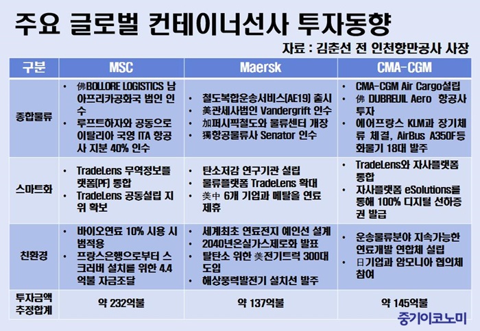 ◇다각화, 디지털화, 대형화 추진=전자상거래 성장세가 촉진되면서 유통과 물류가 통합되고 물류와 항만의 역할에도 변화가 찾아왔다. 글로벌 선사들은 호황으로 확보한 이익을 기반으로 해운 외 확장, 찬환경 스마트화 투자를 통해 경쟁력을 키워가고 있다는 것이다.