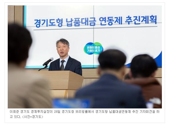 이희준 경기도 경제투자실장은 28일 경기도청에서 기자회견을 열고, 올해 10월로 예정된 상생협력법상 납품대금연동제 시행에 앞서 경기도는 4월부터 ‘경기도형 납품대금연동제’를 도입한다고 밝혔다.