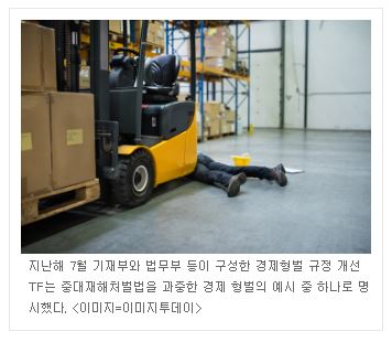 ◇정부 TF, 중대재해법을 과중한 경제 형벌로 명시=정부는 이보다 앞서 지난해부터 중대재해처벌법 개정 의사를 밝혀왔다.