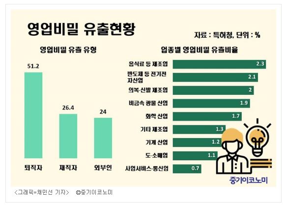 퇴직자에 의한 영업비밀 유출이 절반 이상을 차지한 것으로 조사됐다.
