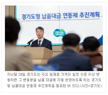앞서 지난달 28일 경기도는 주요 원재료 가격이 일정 수준 이상 변동하면 그 변동분을 납품 대금에 자동 반영하도록 하는 경기도형 납품대금 연동제 추진계획을 발표한 바 있다.