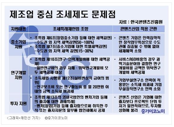 국내 조세제도가 제조업을 중심으로 설계돼 있다보니, 창작인력에 대한 프로젝트 기간 단위의 단기고용(프리랜서 계약), 외부인력을 활용한 창작개발, 무형자산(IP) 투자 및 프로젝트 중심의 창작으로 이뤄진 콘텐츠 산업에서 조세제도를 적용하기 어렵다는 것이다.
