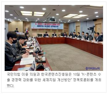 이승희 한국콘텐츠진흥원 콘텐츠산업정책연구센터 선임연구원은 국민의힘 이용 의원과 한국콘텐츠진흥원이 10일 개최한 ‘K-콘텐츠 수출 경쟁력 강화를 위한 세제지원 개선방안’ 정책토론회에서 “콘텐츠 산업은 국가의 미래 경쟁력이 될 고성장 산업이며 국가 문화가 담긴 사회문화적 자본”이라며, “세제지원을 통해 콘텐츠 기업이 새로운 콘텐츠를 계속해서 기획·개발, 제작할 수 있도록 장려하는 것이 필요하다”고 강조했다.