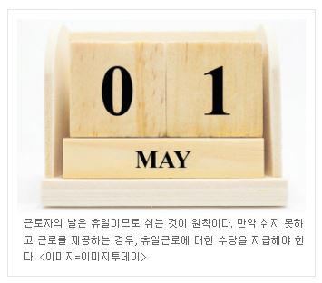 날짜가 5월1일로, 법률에 특정이 돼 있으므로 이 날 근로를 하고 다른 날을 휴일로 대체할 수는 없다. 따라서 근로자의 날에 근로를 했다면 휴일근로수당을 지급해야 하고, 근로자의 날을 다른 날로 대체해 쉬게할 수는 없다(근로기준과-894, 2004.2.20.). 다만 보상휴가제가 적법하게 도입된 사업장인 경우, 보상휴가제 실시는 가능하다. (중기이코노미 객원=노무법인 원 정원석 노무사)