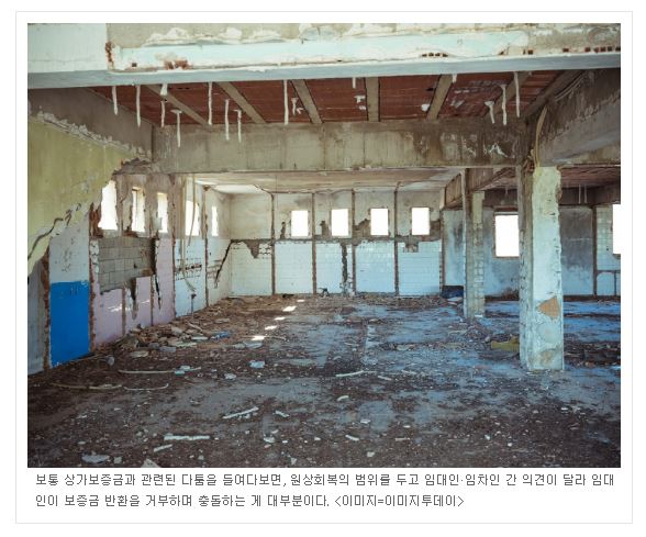 상가보증금은 임대차계약을 종료하면서 임차인이 당연히 돌려받을 수 있을 것이라고 생각하지만 그렇지 못한 경우가 많다. 아무래도 보증금을 돌려받는 단계는 임대차계약을 마무리할 때이기 때문에 더 이상 관계를 이어가지 않아도 돼서, 당사자들이 계약기간 내 상황과 비교해 훨씬 더 무리한 주장을 펼치며 분쟁이 격화되는 것을 자주 볼 수 있다. 보통 상가보증금과 관련된 다툼을 들여다보면, 원상회복의 범위를 두고 임대인·임차인 간 의견이 달라 임대인이 보증금 반환을 거부하며 충돌하는 게 대부분이다.