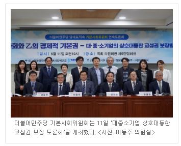 이동주 의원(기본사회위원회 공동본부장)은 더불어민주당 기본사회위원회가 11일 개최한 ‘대중소기업 상호대등한 교섭권 보장 토론회’에서 ‘경제민주화와 乙(을)기본권’이라는 주제발표를 통해, “국민 모두가 성장에서 도태되지 않고 그 과실을 공정하게 누리는 모두의 성장을 추구하기 위해서는 경제민주화 가치를 관철하는 기본권이 도입돼야 한다”며, 소상공인·자영업자의 대등한 권리를 보장할 수 있는 단체구성권과 교섭권 도입의 필요성을 강조했다.