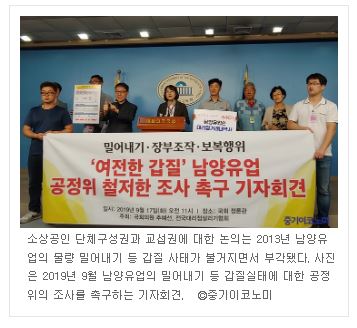 ◇대리점 단체협상권 부정하는 공정위=2013년 남양유업 대리점 갑질 사태가 촉발된 직후, 남양유업은 2020년이 돼서야 대리점단체에 협상권을 부여하기로 했다. 그러나 법률상에서 대리점 단체협상권의 법적 근거를 마련하는 것은 쉽지가 않다. 공정위가 대리점 단체구성권은 동의하고 있지만, 협의권 보장에는 부정적 입장을 표명하고 있기 때문이다.