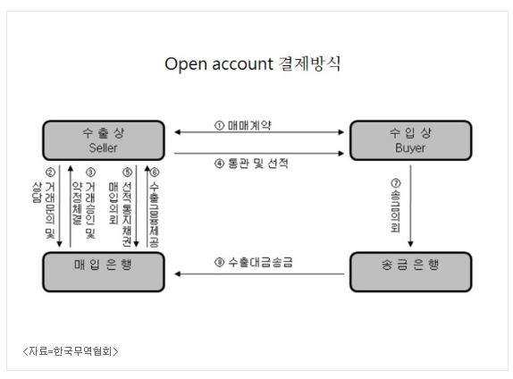 O/A(Open Account) 결제방식은 거래당사자 간 매매계약에 의해 수출자가 계약물품을 선적, 선적서류 원본을 수입자에게 송부하고 선적사실을 통지한 후 매입은행에 매입을 의뢰하면, 매입은행이 수출상의 매출채권을 담보로 수출금융을 제공해 물품대금을 수령하고, 수입자는 물품매매계약서상의 송금시기 조건에 따라 선적일을 기준으로 일정기간 경과한 후 수출자가 지정한 은행계좌에 대금을 사후에 송금한다.