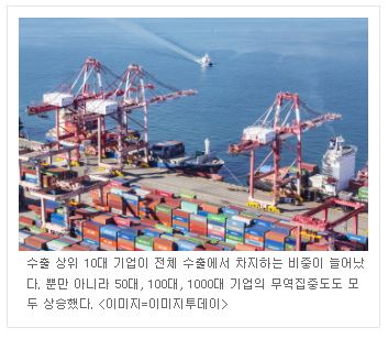 지난해 수출 상위 10대 기업이 전체 수출에서 차지하는 비중이 증가한 것으로 나타났다. 뿐만 아니라 100 대기업과 1000대 기업의 무역집중도가 모두 상승해, 수출에서도 대기업 쏠힘 현상이 심화됐다.