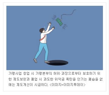 누군가는 “그런 장사를 시작한 당신이 문제야!”라고 말할 수 있겠지만, 이미 정보력과 경험, 경제력 등 ‘기울어진 운동장’에서 점주가 허위·과장된 정보를 제공받고 창업해, 버티려고 안간힘을 쓰다가 결국 적자로 가맹점을 유지할 수 없게 되고, 가맹본부에 폐점을 요구하면 가맹본부가 위약금 폭탄을 안겨 폐점조차 못하게 하는 가맹사업의 현실을 적나라하게 알면 그렇게 쉽게 말하지 못할 것이다.