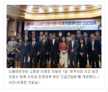더불어민주당 소병훈·이재정 의원이 1일 개최한 ‘후쿠시마 사고 원전 오염수 방류 시도와 민생대책 방안 긴급간담회’에서는 후쿠시마 오염수 방류로 인해 피해가 예상되는 민생 현장 관계자들이 참석해, 이러한 예상 피해 등 우려를 나타냈다.