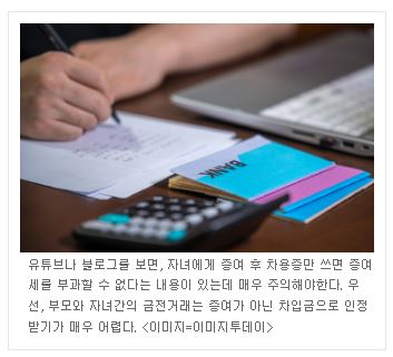 유튜브나 블로그를 보면, 자녀에게 증여 후 차용증만 쓰면 증여세를 부과할 수 없다는 내용이 여과없이 게시돼 있는데 이는 매우 주의해야하는 세무이슈이다. 우선, 부모와 자녀간의 금전거래는 증여가 아닌 차입금으로 인정받기가 매우 어렵다. 다수의 판례는 제3자간에 주고받는 통상적인 차용증과 같은 형식과 내용을 갖춰야 한고, 실제로 자녀가 차용증 내용대로 이자를 내야 증여가 아닌 차입금으로 보고 있다. 판례의 의도는 차용증이 있더라도 증여세 회피를 위해 외관상 차입의 형태만 갖춘 경우에는 차입금으로 볼수 없다는 것이다. 만약 차용증의 형식과 내용이 통상적이지 않거나, 차용증만 쓰고 이자를 지급하지 않는다면 차입금이 아니라 증여세가 부과될 수 있다.