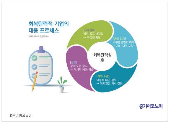 불확실성이 뉴노멀인 시대가 예상되면서 기업들은 생존과 성장을 위한 묘안을 짜내기 위해 고군분투하고 있는데, 특히 회복탄력성에 주목하고 있다. 회복탄력성이란, 역경 상황에서 제자리로 회귀할 뿐만 아니라 지속적으로 성장하는 능력을 말한다. 예상하지 못한 충격을 능동적으로 대처해 새로운 성장의 원동력으로 전환하는 개념이다.