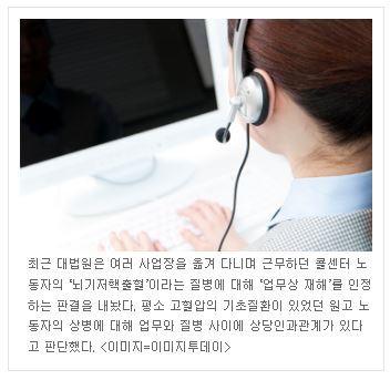 최근 대법원은 여러 사업장을 옮겨 다니며 근무하던 콜센터 노동자의 ‘뇌기저핵출혈’이라는 질병에 대해 ‘업무상 재해’를 인정하는 판결(대법원 2022두47391. 선고일 2023. 4.13.)을 내놨다.
