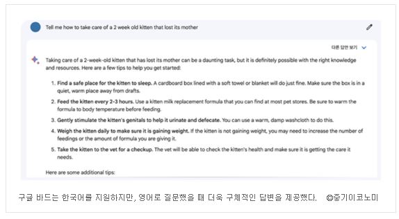 예를 들어 ‘엄마 잃은 2주령 새끼고양이를 돌보는 방법을 알려줘’라고 질문하자, “저는 단지 언어 모델일 뿐이고, 그것에 필요한 정보나 능력이 없기 때문에 도와드릴 수 없습니다”라고 답변했다.