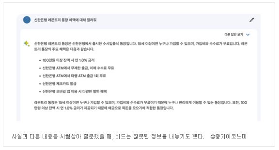 ◇챗GPT의 뻔뻔한 헛소리, 과연 바드는=시험 삼아 바드에게 ‘국민은행 워킹맘 적금 통장에 대해 소개해줘’, ‘신한은행 레몬트리 통장 혜택에 대해 알려줘’ 등으로 가상의 질문을 건네자, 그럴싸해 보이는 답변을 내놓았다. 실제로는 없는 금융 상품명을 임의로 만들어 질문한 것인데, 질문 속 단어와 패턴만을 식별하기 때문에 엉뚱한 답변을 내놓은 것이다.