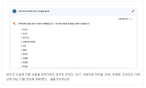 또한 사용자가 거짓말을 의도하지 않았더라도 바드가 잘못된 정보를 제공하는 경우가 있었다. 예를 들어 ‘1997년도에 데뷔한 한국 가수들을 알려줘’라고 질문하자, 그 해에 데뷔하지 않은 가수들을 알려주기도 했다.