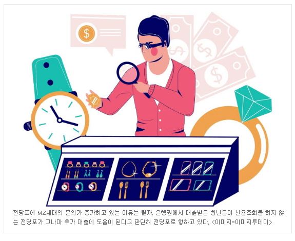 물건을 담보로 잡고 돈을 빌려주는 사금융업의 일종인 전당포에 MZ세대의 문의가 증가하고 있는 이유는 뭘까. 바로 은행권에서 대출받은 청년들이 신용조회를 하지 않는 전당포가 그나마 추가 대출에 도움이 된다고 판단해 전당포로 향하기 때문이다.