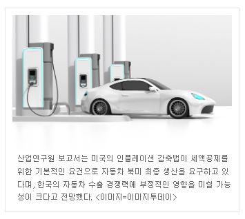 보고서는 미국의 인플레이션 감축법으로 인해 “전기차 세액공제를 받기 위해서는 전기차 배터리에 포함된 중요 광물 요구사항과 배터리 구성요소 요구사항을 만족시켜야 한다”며, “이에 더해 세액공제를 위한 기본적인 요건으로 자동차 북미 최종 생산을 요구하고 있어, 우리나라의 자동차 수출 경쟁력에 부정적인 영향을 미칠 가능성이 크다”고 전망했다.