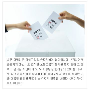 최근 대법원 전원합의체는 현대자동차가 취업규칙을 근로자에게 불이익하게 변경하면서 근로자의 과반수로 조직된 노동조합의 동의를 받지 않아 그 효력이 문제된 사건에 대해, ‘사회통념상 합리성’이 있다는 이유로 집단적 의사결정 방법에 따른 동의조항의 적용을 배제한 기존 대법원 판례를 변경하는 취지의 판결을 내렸다[대법원 2023. 5.11. 선고 전원합의체 판결 2017다35588, 2017다35595(병합)]