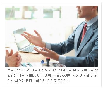 ◇상가에 대한 설명이 부족했거나 허위라면=분양대행사에서 계약내용을 제대로 설명하지 않거나, 사실과 다른 내용을 적극적으로 이야기하는 방식으로 허위과장 광고하는 경우가 많다. 이는 기망, 착오, 사기에 의한 계약해제 및 취소 사유가 된다.