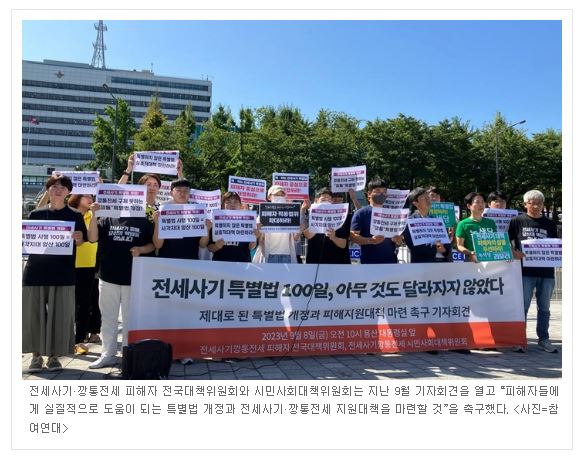 보고서는 특별법 상 피해자로 결정되더라도 지원대책이 한정적이라며, “실효성 있고 신속한 피해자 구제를 위해 공공의 보증금 채권 매입을 통한 ‘선구제 후회수’ 방안 도입이 필요하다”고 강조했다.