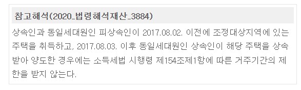 결국 피상속인이 주택을 취득할 당시 비조정대상지역이었고, 해당 지역이 조정재상지역으로 바뀐 이후 동일 세대원이었던 자가 상속을 받았다면 상속개시일 현재 상속주택이 조정대상지역에 위치하고 있더라도 거주요건이 적용되지 않는 것이다. 피상속인이 주택을 취득할 당시 비조정대상지역에 위치하고 있었고 동일 세대원이 상속을 받았다면 거주요건까지 상속인이 승계받는 것으로 보는 것이다.