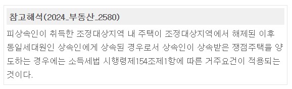 한편, 피상속인이 조정대상지역에 위치한 주택을 취득하고 이후 조정대상지역에서 해제되었을 때 상속이 개시된 경우 동일세대원이 상속을 받은 때에는 거주요건 적용 여부에 대해서 고민될 수 있다.