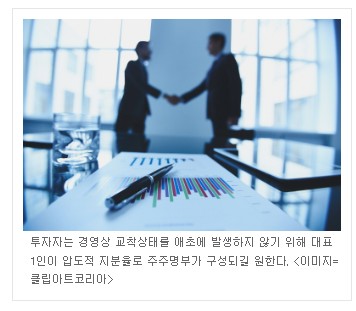 스타트업의 경우 빠른 의사결정과 실행력이 생명이라고 할 수 있다투자자는 경영상 교착상태를 애초에 발생하지 않기 위해 대표 1인이 압도적 지분율로 주주명부가 구성되길 원하는 것이다.