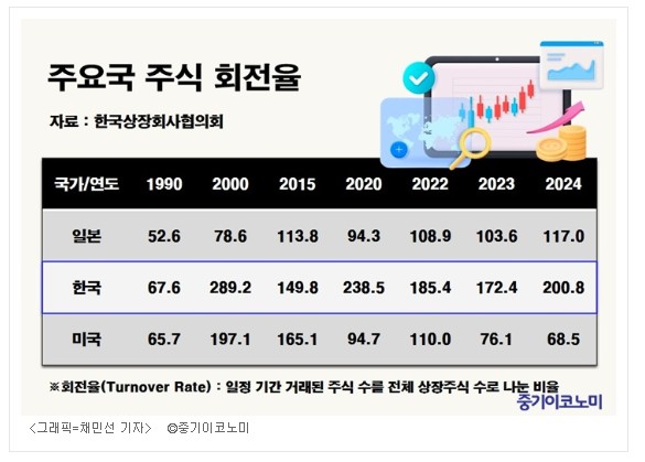 월드뱅크 통계에 따르면, 한국 개인주주의 평균 주식 보유기간은 약 3~6개월로 조사됐다. 특히 2020년 이후 개인투자자 유입이 폭증하면서 평균 주식 보유기간이 코스피 2.7개월, 코스닥 1.1개월까지 단축되는 등 단기매매가 더욱 확대되는 상황이다. 2024년 기준 한국의 주식시장 회전율은 200.8로 미국(68.5)의 약 3배, 일본(117.0)의 1.7배에 달한다. 회전율은 일정 기간 거래된 주식 수를 전체 상장주식 수로 나눈 비율을 말한다.