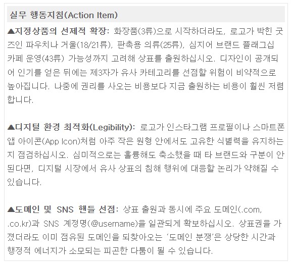 디자인 시안이 확정되는 순간실무자는 지금 무엇을 파는가가 아니라 앞으로 이 로고를 어디까지 붙일 것인가를 고민해야 합니다브랜드가 성공하면 카테고리 확장은 필연적이며준비되지 않은 영토 확장은 상표권 알박기의 타깃이 되기 십상입니다.